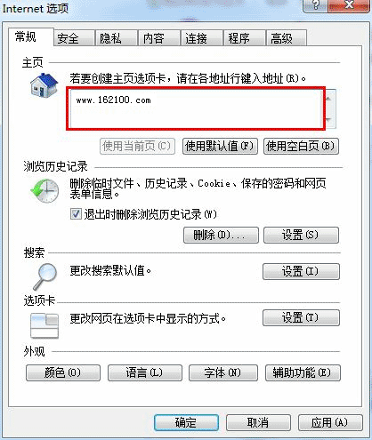 2)然后在打开的对话窗口中的主页栏的地址输入框中输入“http://www.xj0311.cn/”,然后点击窗口上方的“应用”按扭即可,如下图所示: