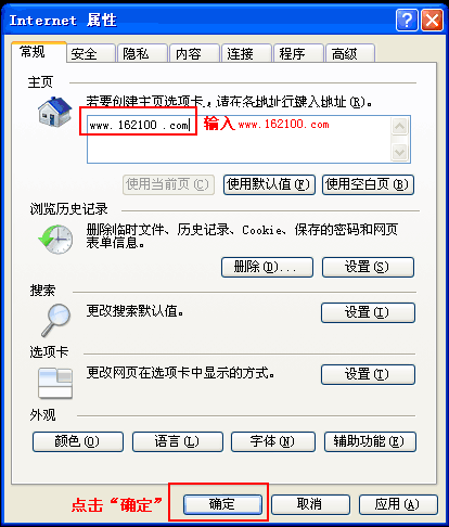 然后在打开的对话窗口中的主页栏的地址输入框中输入“http://www.xj0311.cn/”,然后点击窗口下方的“确定”按扭即可,如下图所示:
